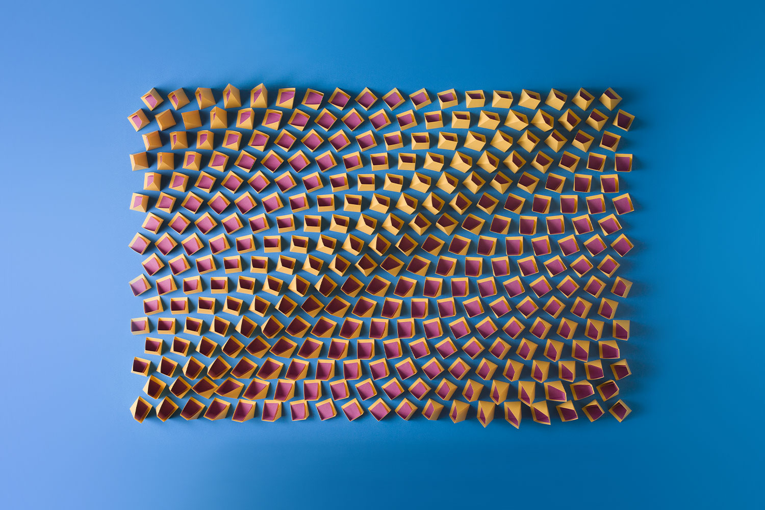 This wall relief is made from yellow and violet hand folded paper mounted on a blue backboard. The artwork was inspired by colour and movement.