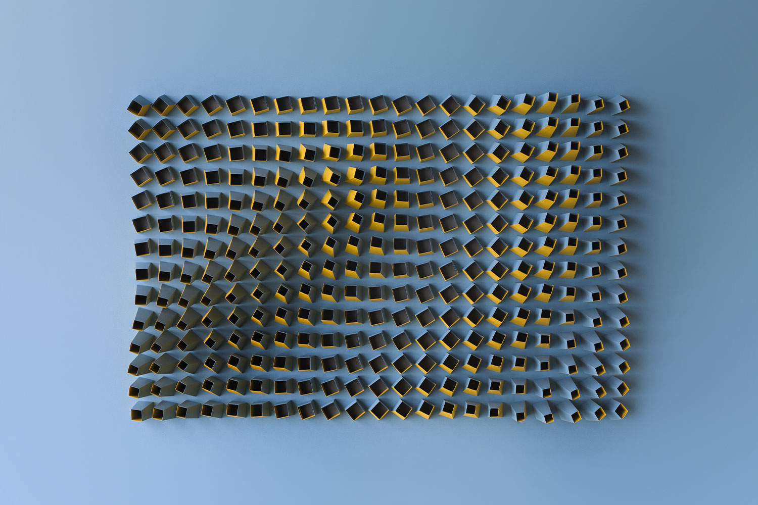 This wall relief is made from blue and yellow paper folded into chimney-like elements that create a movement of colours throughout the piece.