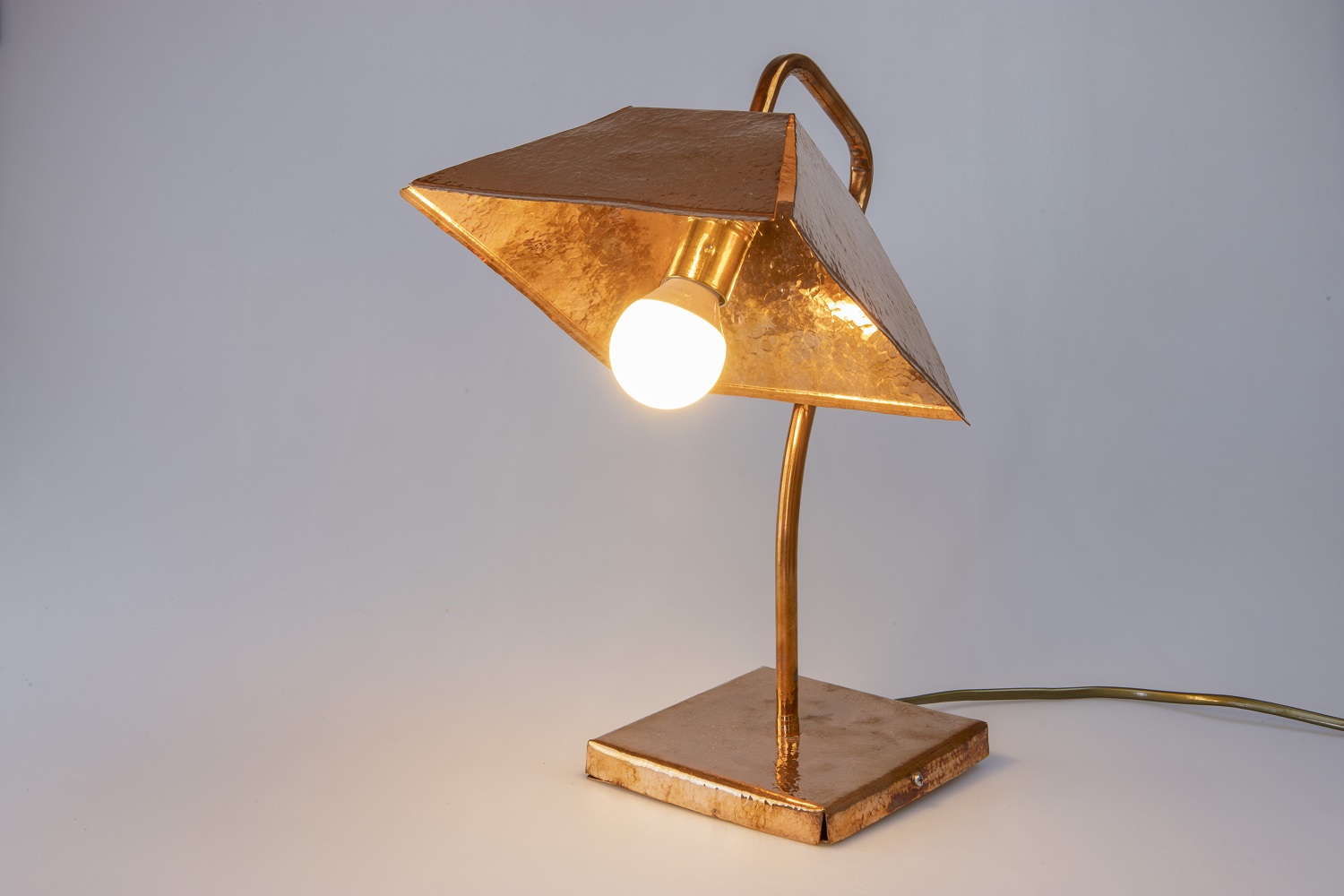 A small table lamp entirely made of hand hammered copper. The silhouette of the lamp is created by an open square lamp shade, which lets the light reflect down in a soft manner. It stands on a square base.