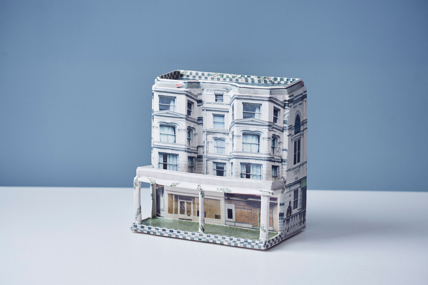 This sculptural piece is handcrafted from stoneware and digitally printed designs transferred to the surface. Alice Mara also uses melted glass to adorn the façade of the ceramic sculpture. This piece represents a UK seaside town with beautiful regency architecture juxtaposed with closed, boarded up shops.
