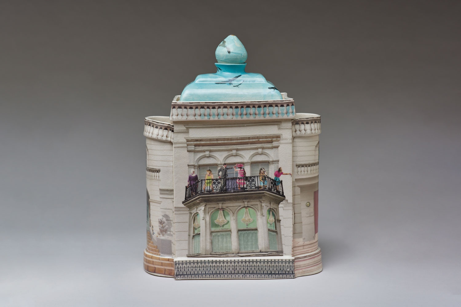 This piece represents the grandeur of a seaside building, the back of the building is decrepit. The sculptural piece is handcrafted from stoneware and digitally printed designs transferred to the surface.