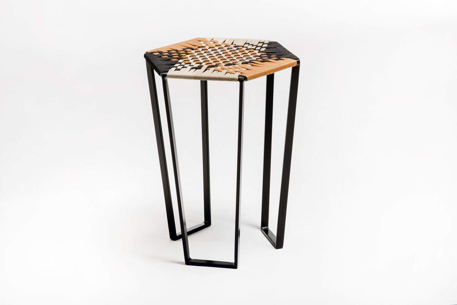 This modern iron structure with a hexagonal shape, can be used as a stool or coffee table. The top is hand woven with Okeo-Tex/Reach-certified polypropylene threads yarn. The weave creates a three-dimensional optical illusion.