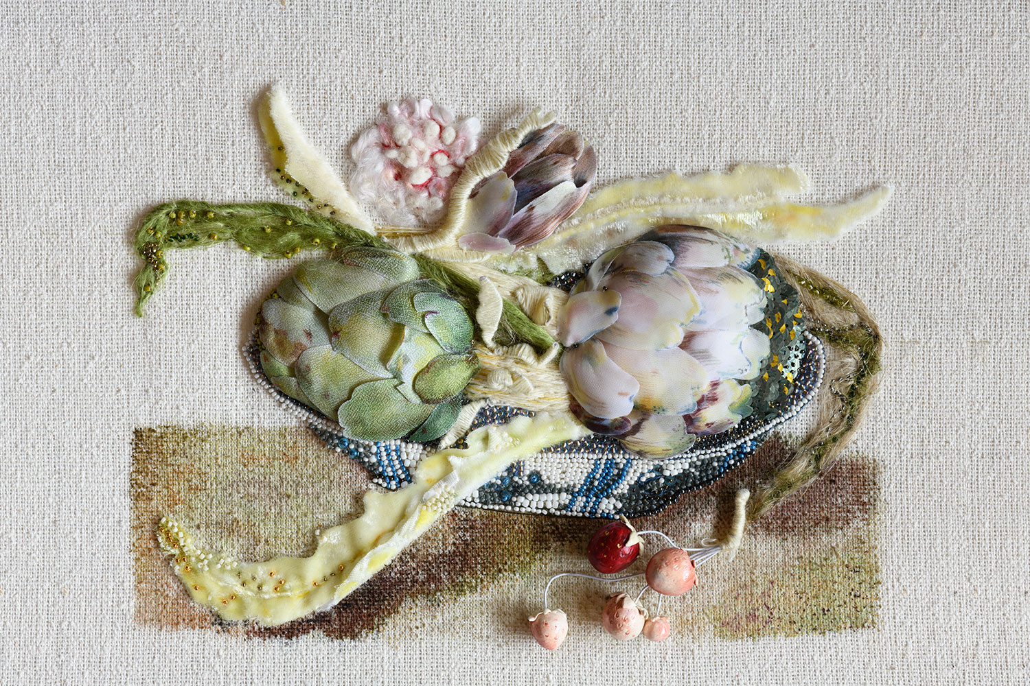 This piece was inspired by Giovanna Garzoni's painting. It showcases creating visual effects in embroidery. The two central artichokes on the beaded dish – one in natural green colour, the other one in purplish-white – are made of silk elements, manually dyed and formed. They are framed by the long dry-yellow leaves. The driest one is made of flax and algae fibres. The wild strawberry is a detachable brooch. The berries are made of clay and hand painted.