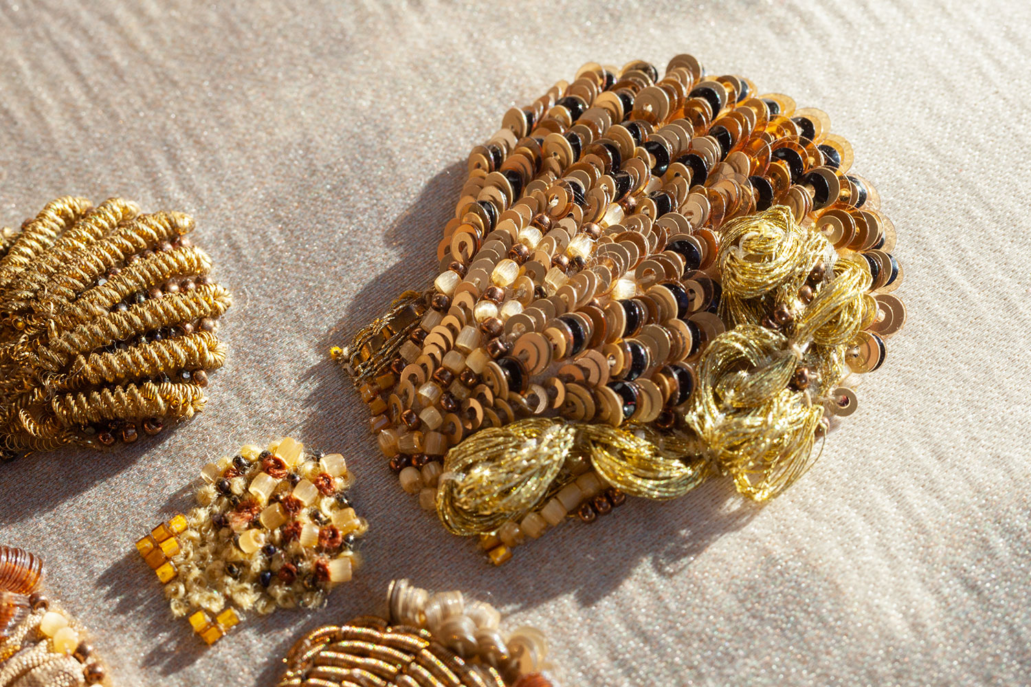This piece, part of the Acqua Alta diptych, demonstrates volume embroidery at its finest. Each shell is made using different materials but all in shades of gold. The biggest shell sparkles with sequins and beads, decorated by metallic lace that imitates a natural defect that any shell may have. The middle-sized shell mimics perfectly the ribbed structure of the shell with the help of the purl wire.