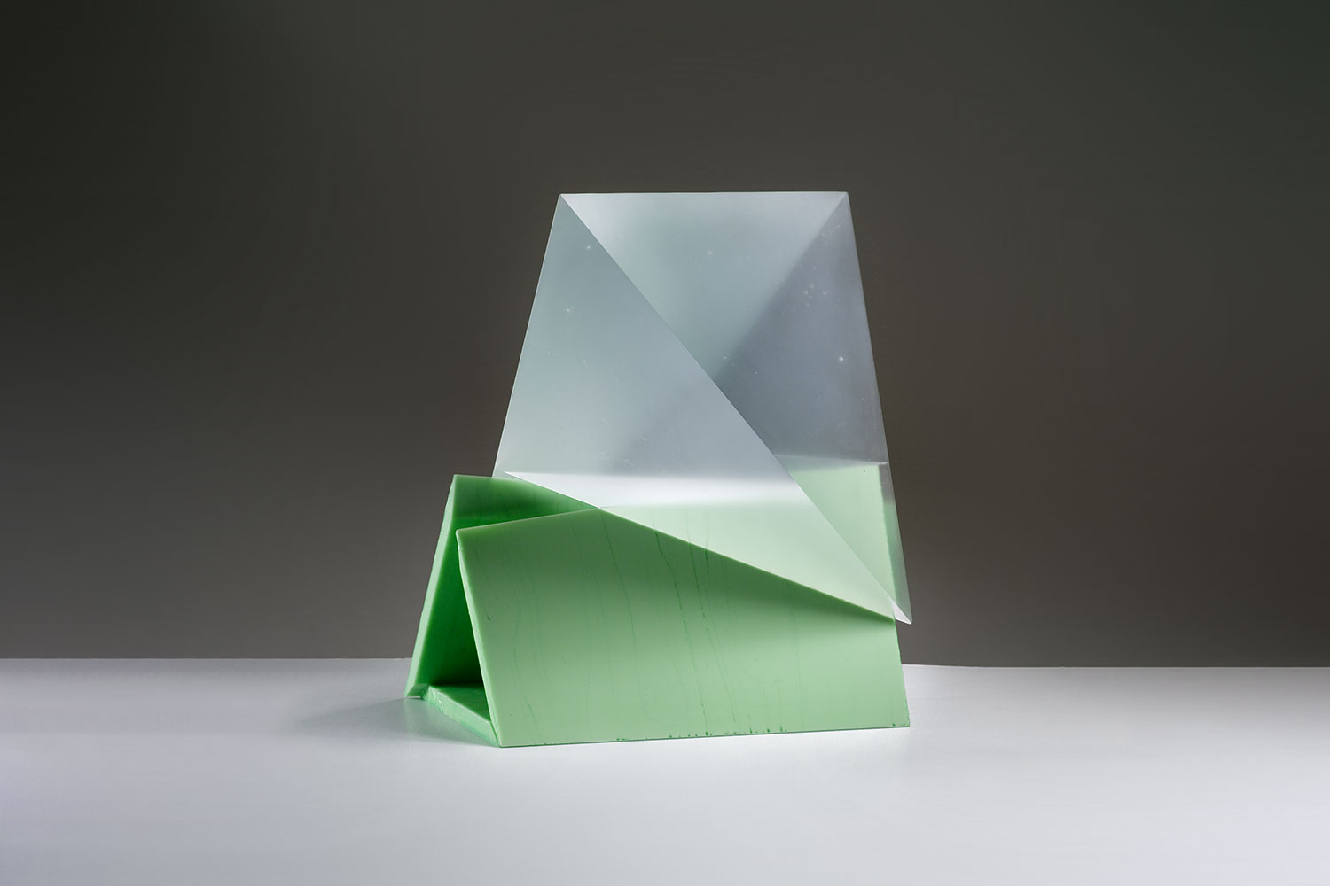 This sculpture is formed of mould melted green and white glass geometric forms positioned in two parts.