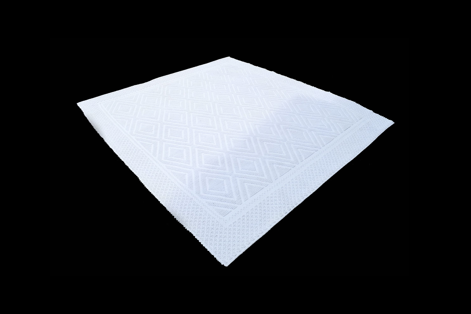 This carpet is entirely woven by hand by Isabella Frongia using a local technique known as Pibiones. Using this ancestral technique, Isabella weaves the fabric from 100 percent white cotton with intricate designs of rhombuses, worked in relief.