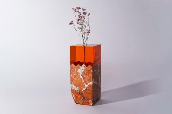 Volubilis is a conceptual sculptural union between two different architectural archaeological relics: the encounter between a classic capital and a section of industrial double T beam. The capital is made of scagliola, a technique of artificial Rima marble in imitation, and exaltation of the "Breccia centopietre" marble and sinks in a portion into a vertical double T beam made of glossy patinated bronze.