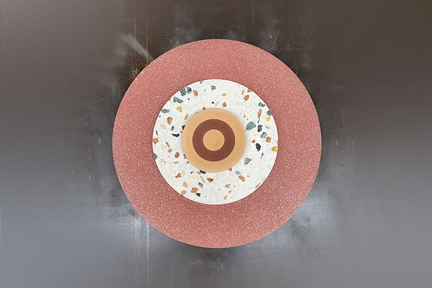This piece by mosaic maker Iván Alvarado is made from cement, marble and pigments. It is composed of three circles, with the bigger part of a light pink colour, the medium one white with some pigments of colour, and the third one alternating rings of beige and brown.