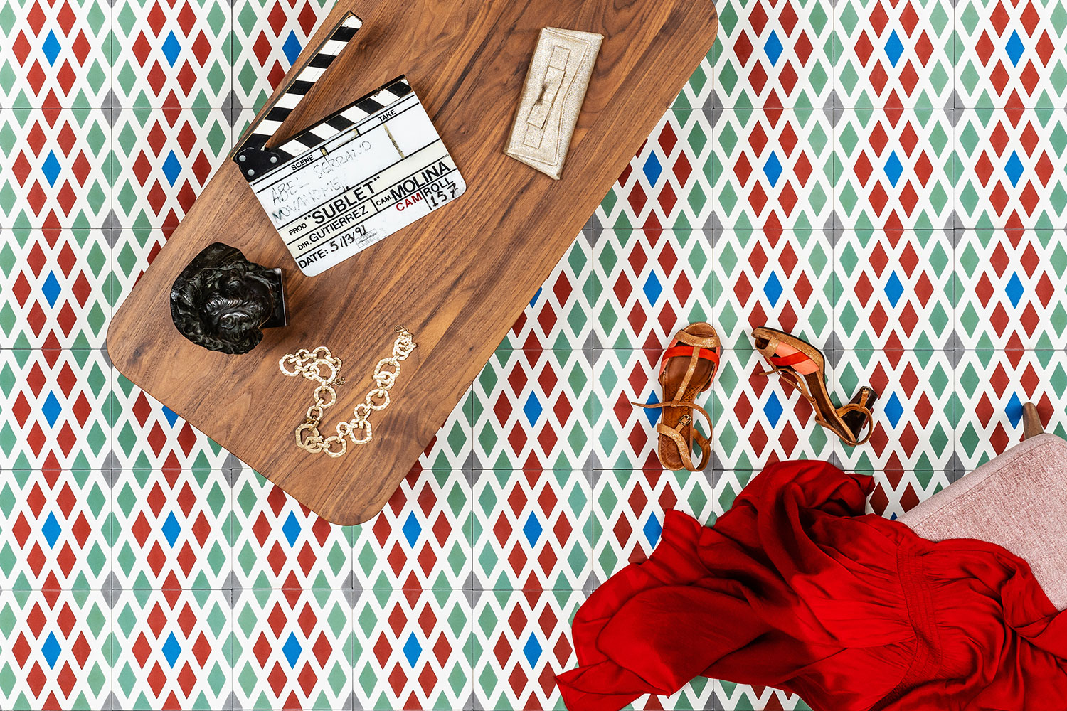 This design is part of Iván Alvarado's Stone Tissue collection. In this series, the mosaic maker used weaves of all periods for inspiration and turned them into cement tiles. Here, the result is a pattern composed of a diamond shape with light green, red, blue and white colours alternating.