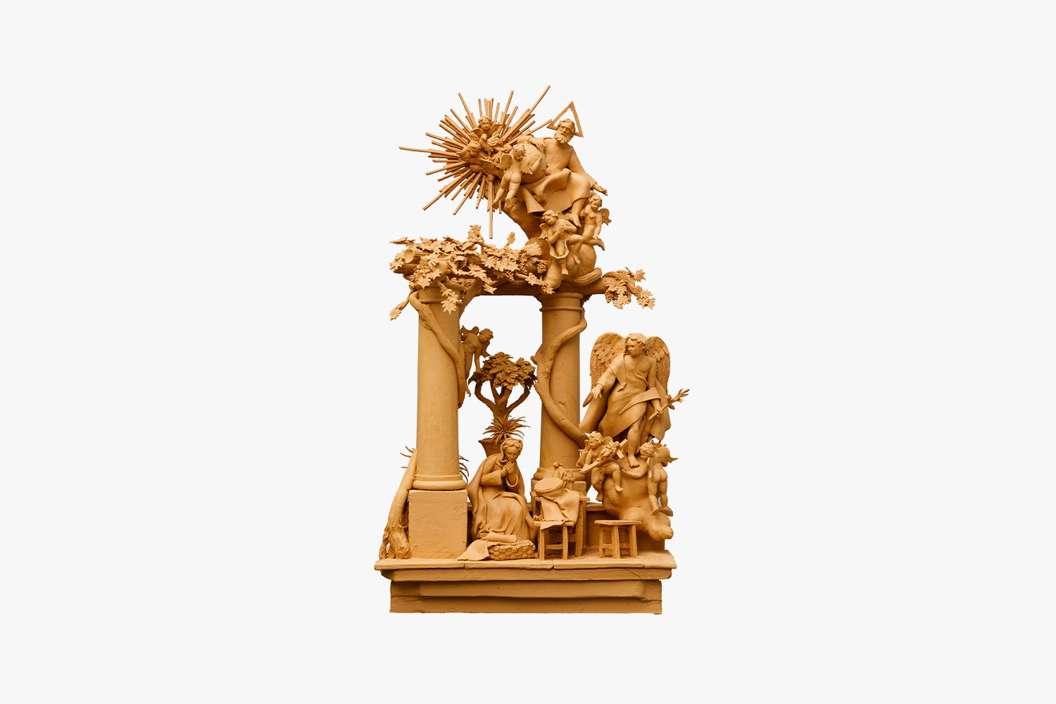 This ceramic sculpture of the Annunciation has been modelled from terracotta. The Archangel Gabriel, on a cloud, announces the coming of Jesus to Mary. The two figurines carry two warning signs in their hands: the cross and the diadem with which Mary will be crowned Queen of Heaven. The vine climbs up the columns, in the Bible, a symbol of wellbeing, fertility and blessing.