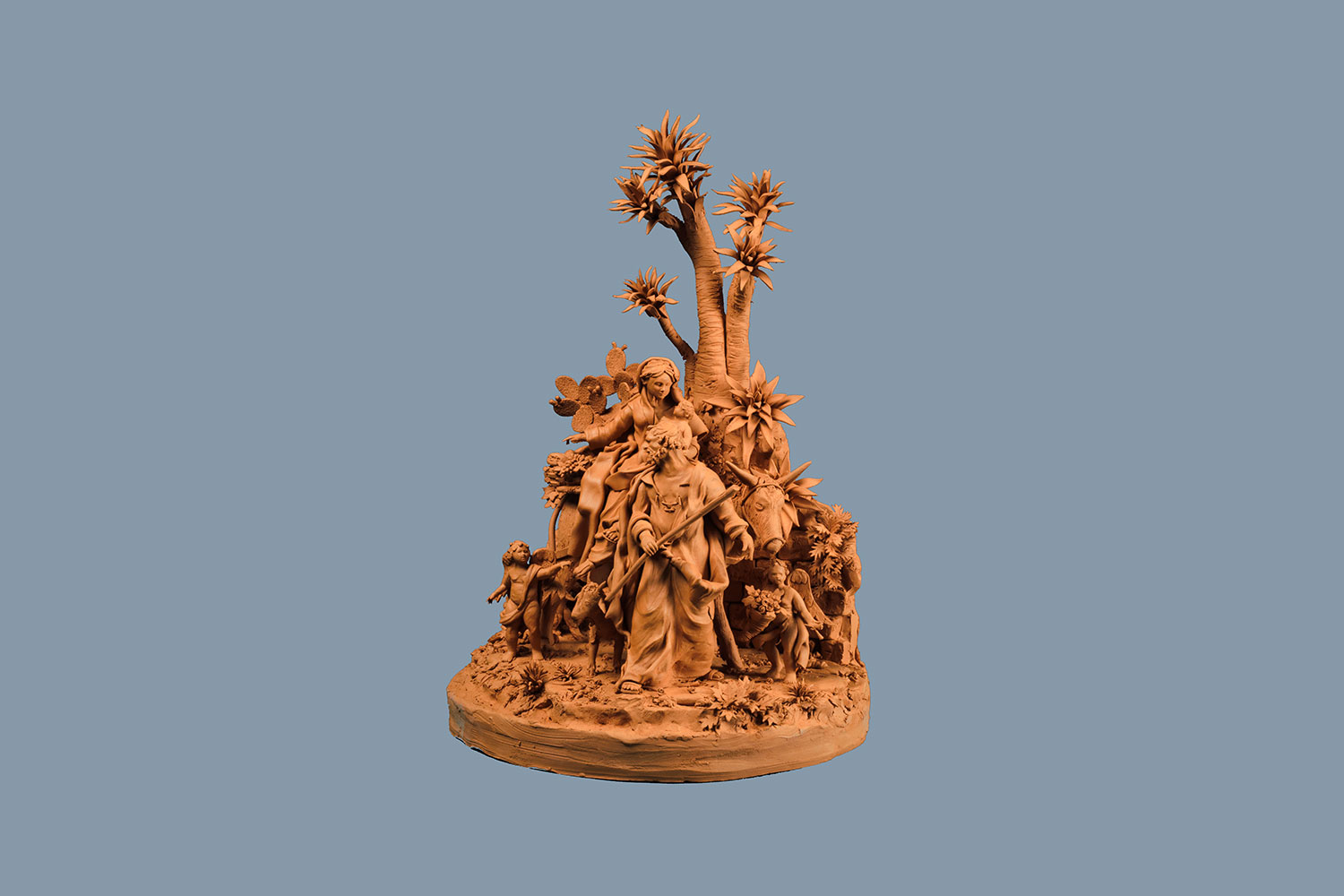 This sculptural rendition of the Flight to Egypt is hand modelled from terracotta. A figurine shows Joseph on the way to Egypt, while Mary observes Jesus. Another, from a wicker cornucopia, anticipates the way, throwing flowers down. The vegetation is characteristic.