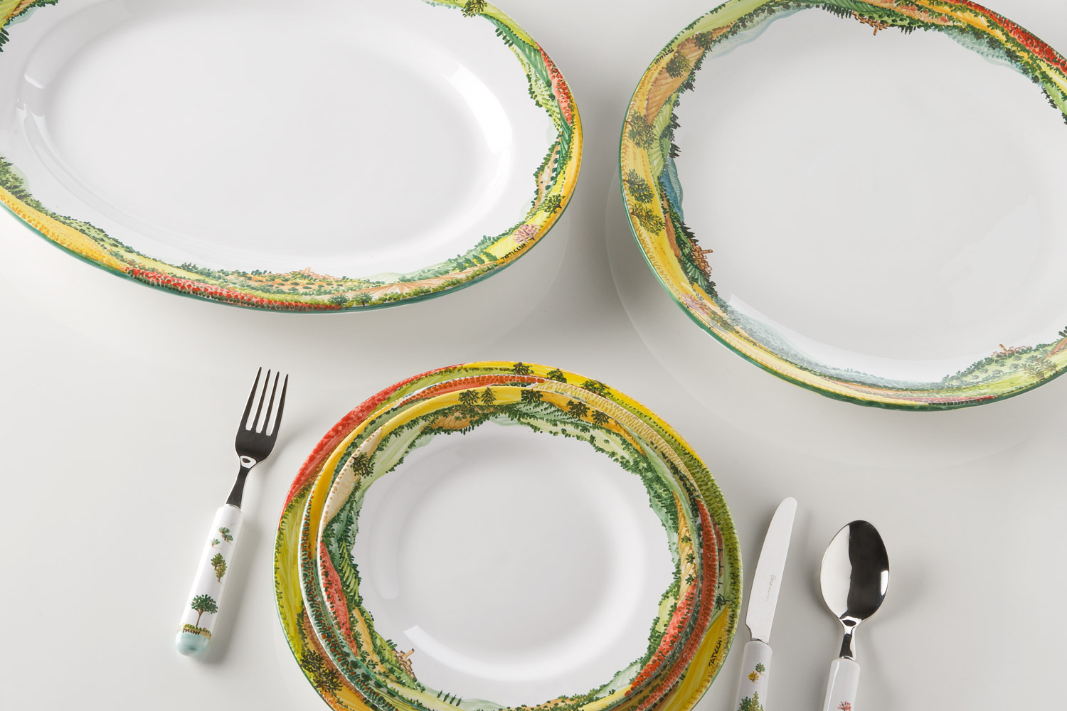 Each plate, handcrafted from terracotta and lead-free glaze, has been adorned with its own unique and original decoration, hand-decorated with a brush tip, inspired by the typical colours of the Umbrian countryside and its striking views.