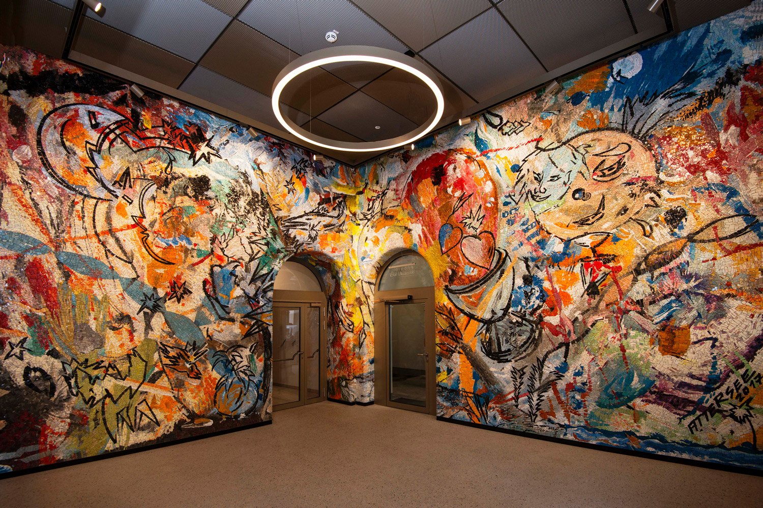 This large wall mosaic, made with the direct technique, covers the entrance to a complex of private offices. The mosaic was made from a sketch by Austrian artist, Christian Ludwig Attersee. The work is built with polychrome smalti free of dangerous substances such as lead and arsenic. The richness and the movement of the tesserae succeeds in replictaing the multiplicity of colours and brushstrokes that are the distinctive feature of this Austrian artist.