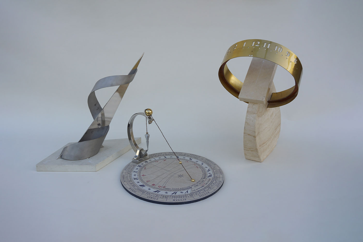 Various types of horizontal and sculptural type garden sundials. All are individually designed based on the geographical coordinates of the place where they are installed. The range provides the possibility of choosing the type, materials, dimensions and all the various possibilities of time systems or astronomical indications to be indicated on the instruments according to the different needs of the clients.