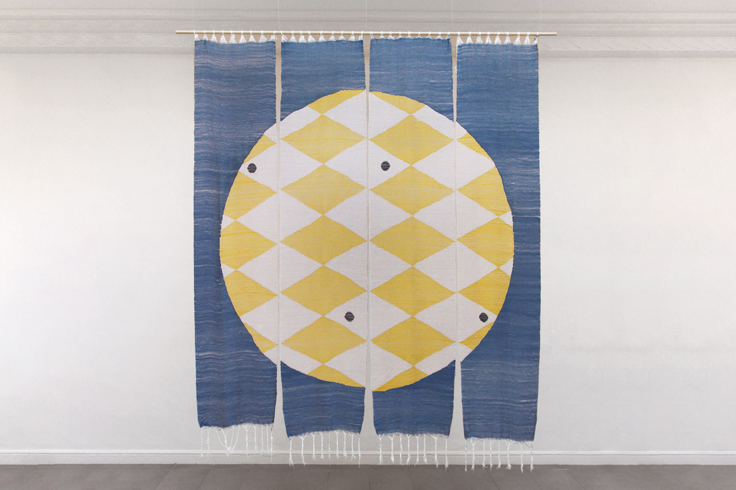 This large woven hanging by Hannah Waldron is made using a tapestry technique. The design depicts a sun with a harlequin pattern within the central circle, it is made out of cotton, linen, wool and woad. The yellow and white beautifully stand out on the blue background.