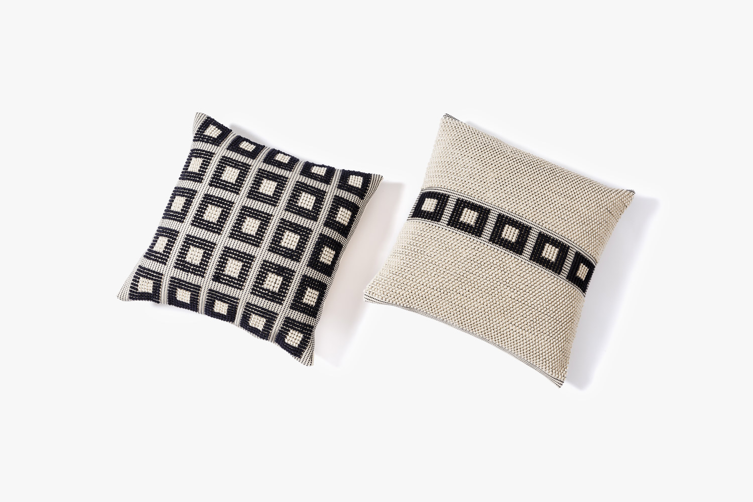 These two cushions have a decorative motif with precious graphic elaborations. They are crafted with the manual technique of semi-full pibiones. Made from cotton, the cushions are designed to creatively reinterpret tradition, giving them a more contemporary character.