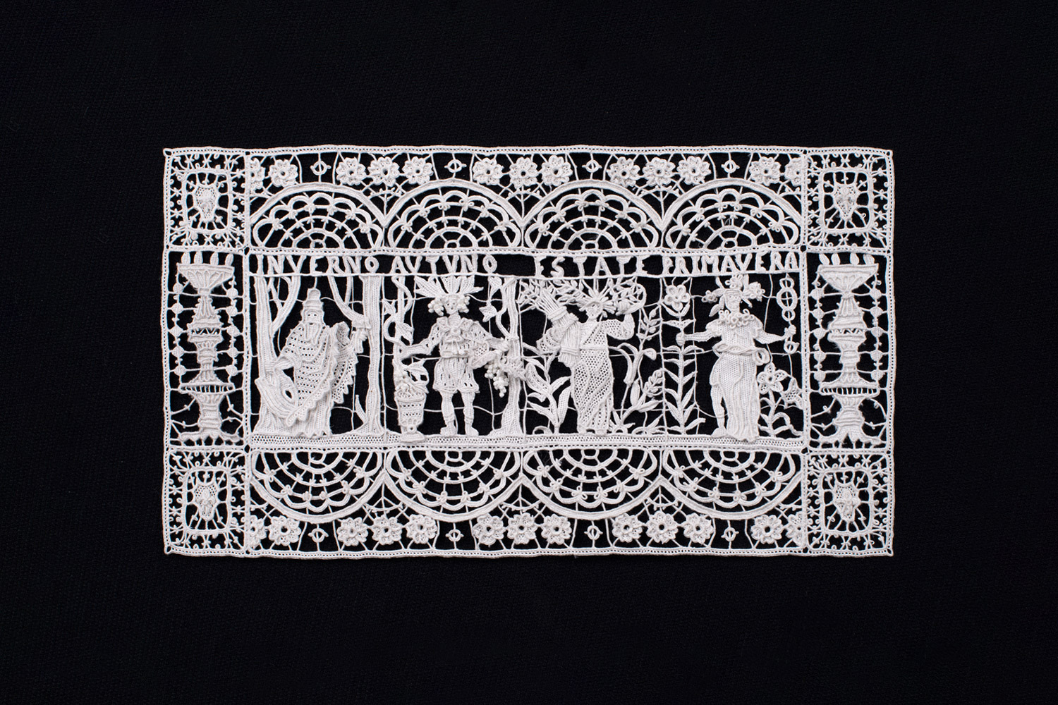 This cotton lace tablepiece is a reproduction of the piece exhibited during the 1906 International Simplon Exposition, during which it was unfortunately burnt. The drawing by Cesare Vecellio was taken from: Crown of noble and virtuous women. This reproduction was exhibited for the six-month duration of Expo Milano 2015.