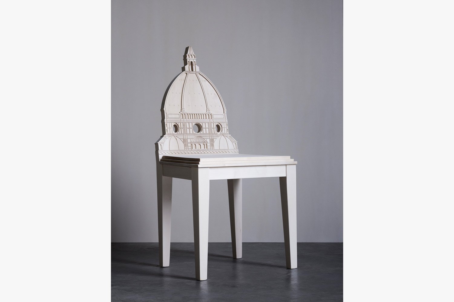 A stunning tribute to the majestic Santa Maria del Fiore Church of Florence by Italian Renaissance artists Filippo Brunelleschi and Arnolfo Di Cambio. This chair, crafted and carved by hand from solid wood, is a singular and charming object created by Cosimo De Vita for his exclusive Cityng Collection.
