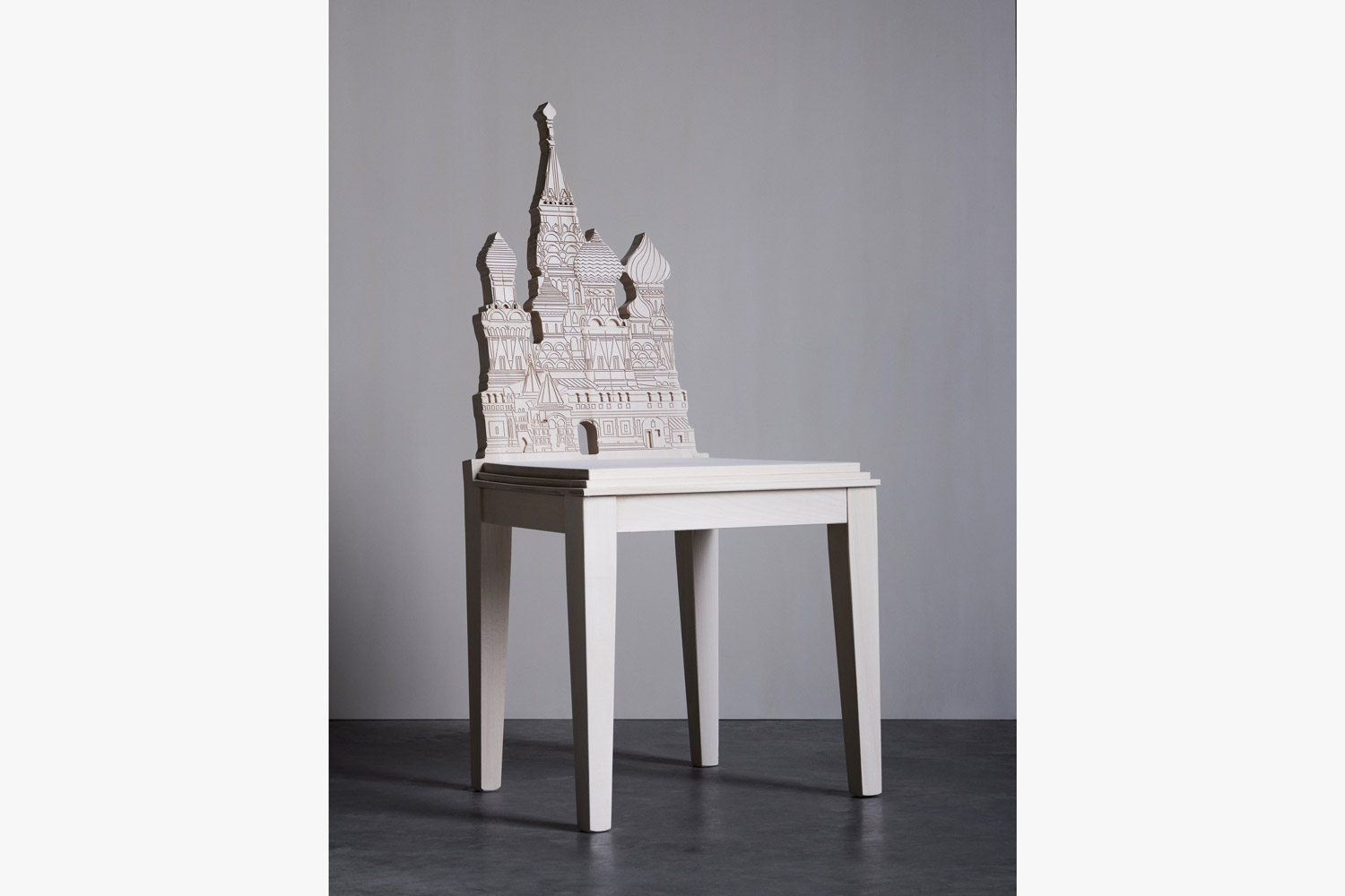This bold and stately design by Cosimo De Vita pays homage to the majestic San Basilio Church of Moscow, Russia. It is crafted of solid wood and distinguished by a handcarved backrest depicting a realistic interpretation of the renowned church.
