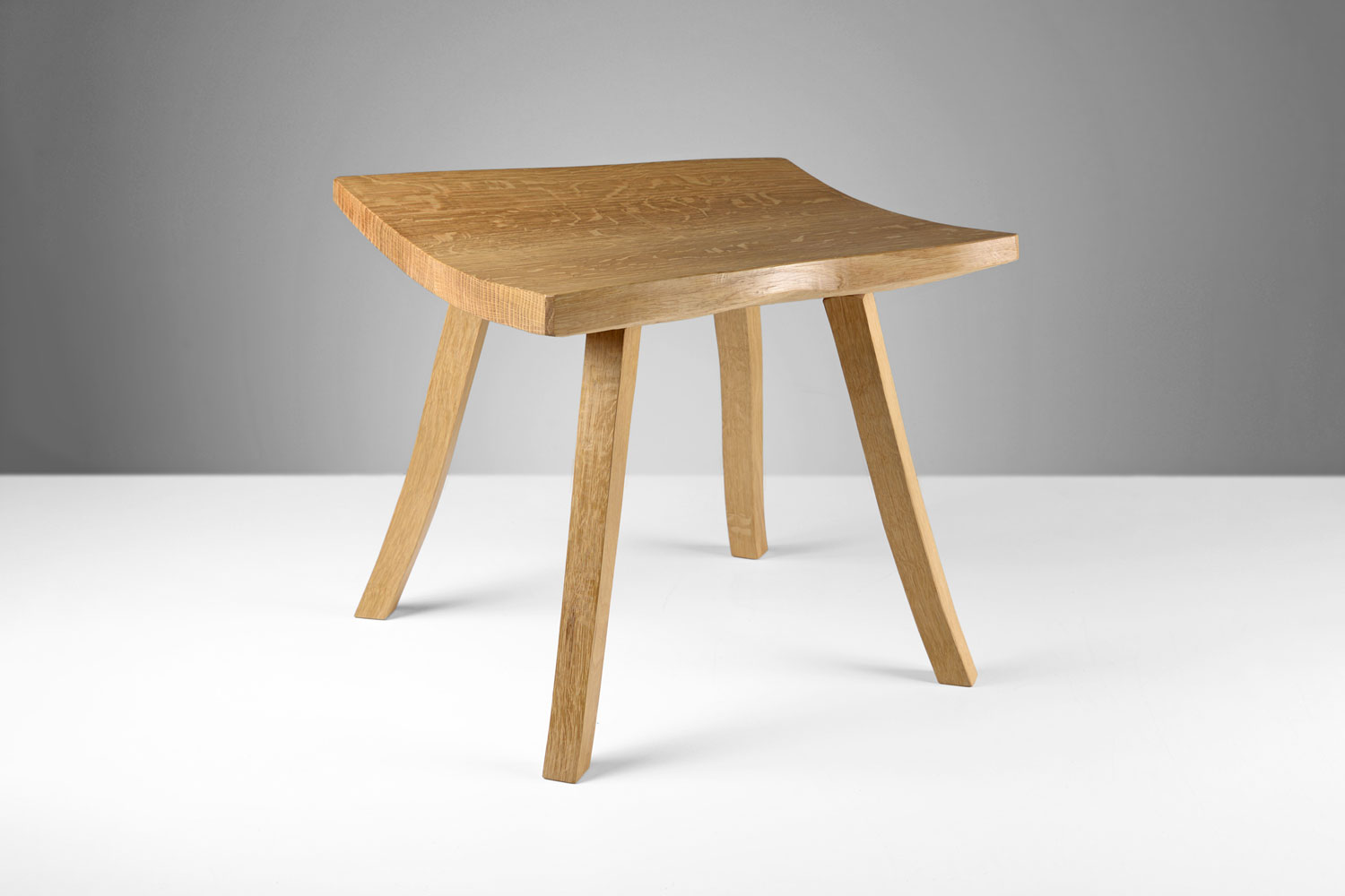 Shadows of moonlit tree-branches inspired the carving of this cleft oak stool that casts a pattern when illuminated. The back panel is also structural to the seat and ends. The wedge profile of the cleft oak used is strong for simple joints and a beautifully undulating seat top. It's a generous seat for one, or an intimate seat for two.