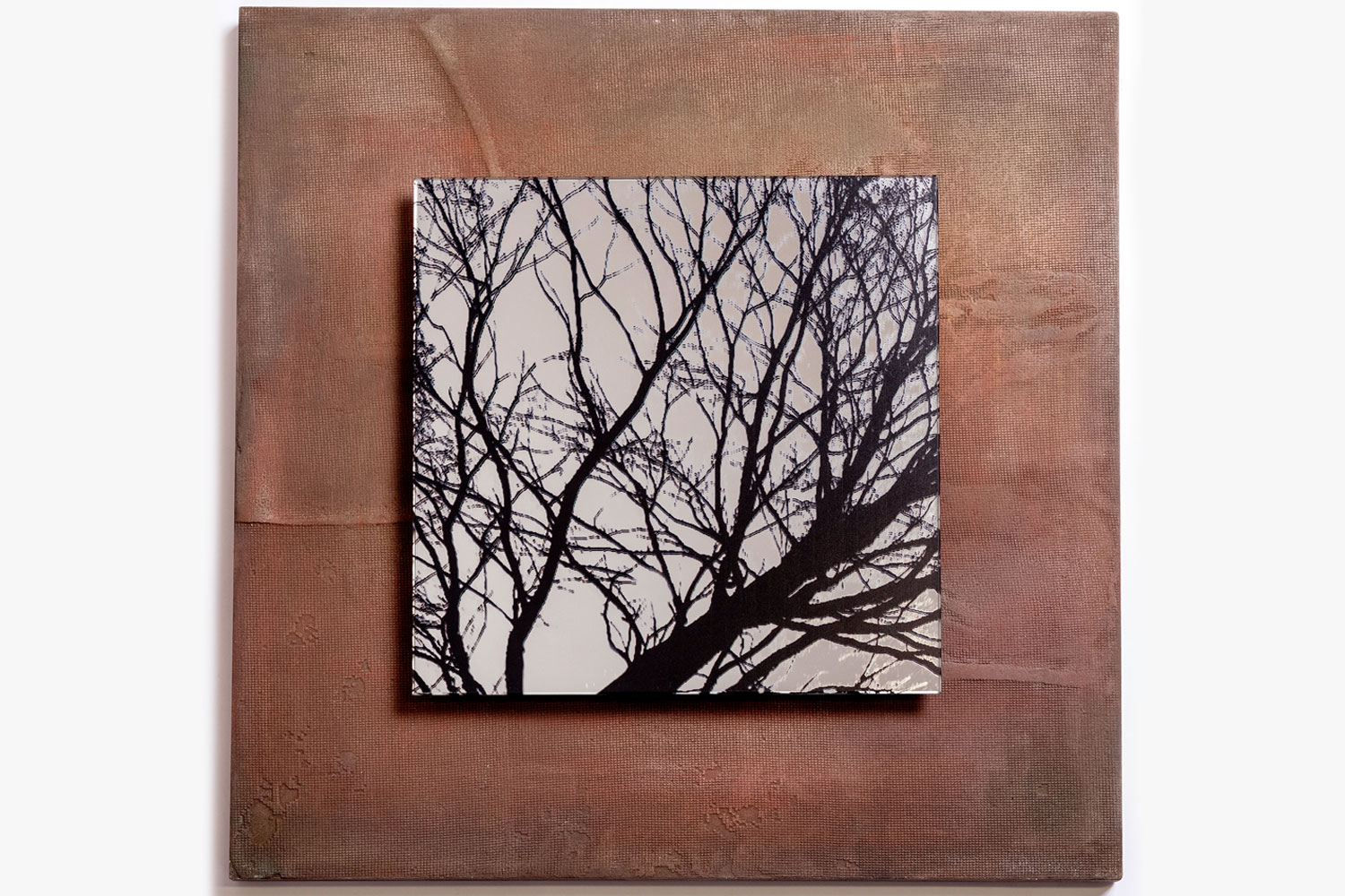 This artistic mirror is a limited edition. Photography is printed on a mirrored surface and placed in a wooden panel with artistic and artisanal covering in steel coloured pigments.