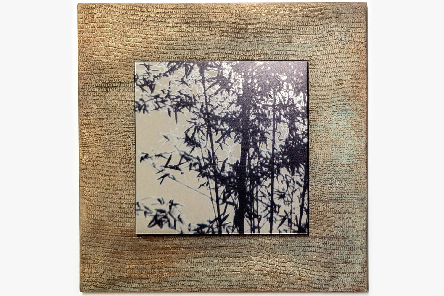 Photography of bamboo shadows on the mirror are placed on a wooden panel with artistic and artisanal covering in oxidised copper-coloured pigments. This artistic mirror is a limited edition.