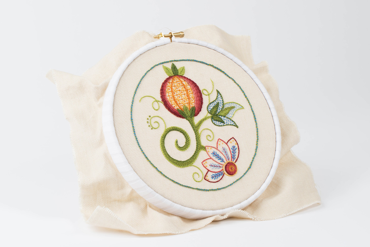 This is a sampler created for the Royal School of Needlework in linen and wool, depicting a pomegranate fruit and flower in the Jacobean era style.