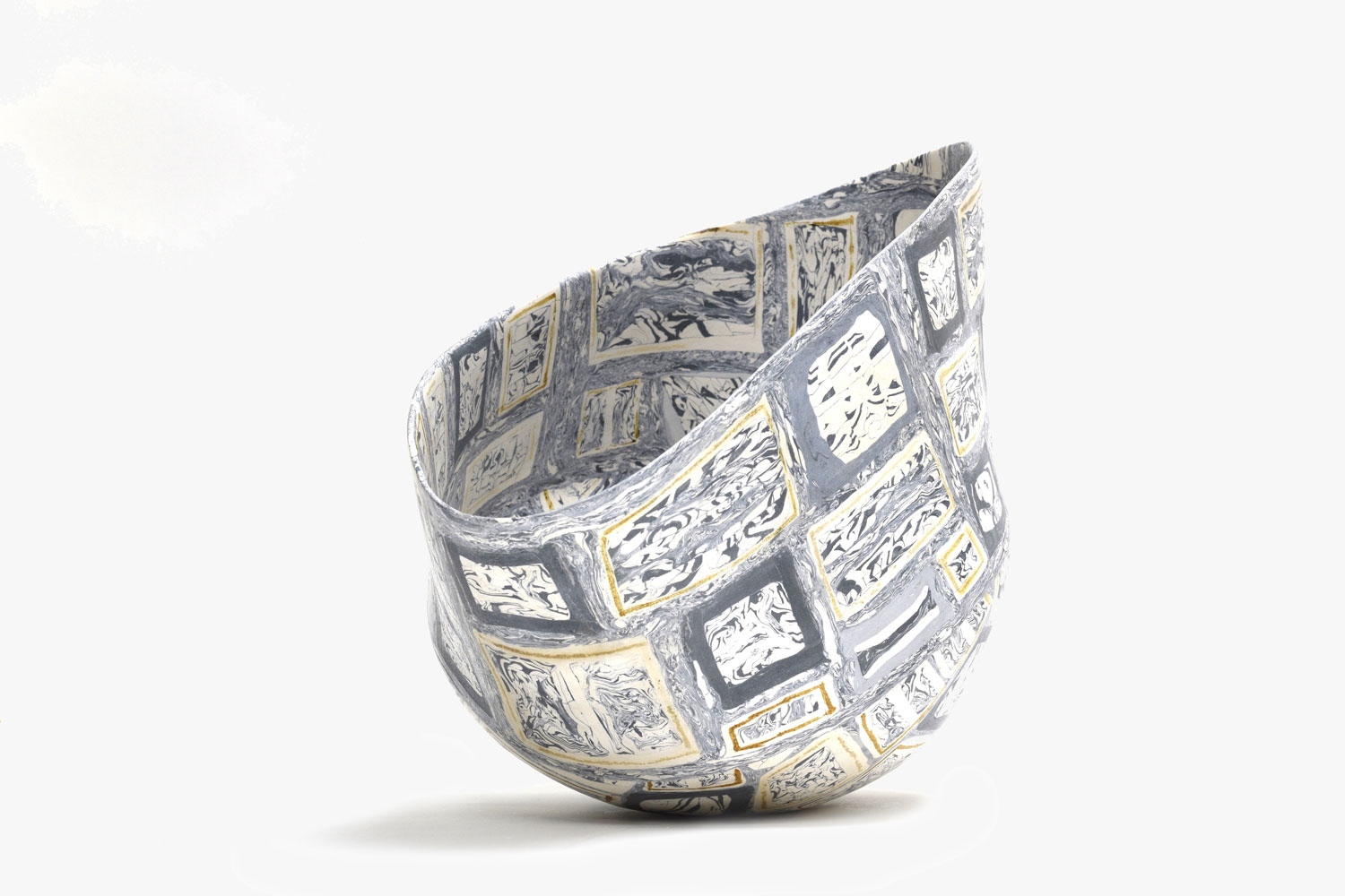 This large Nerikomi Sculptural Bowl is slab built. It is unglazed and smoke-fired. Barbara's inspiration is drawn from the geometry of patterns in nature, laying down of strata and symmetry sliding into asymmetry. This is part of a never-ending, obsessive exploration of the balance between symmetry and asymmetry.
