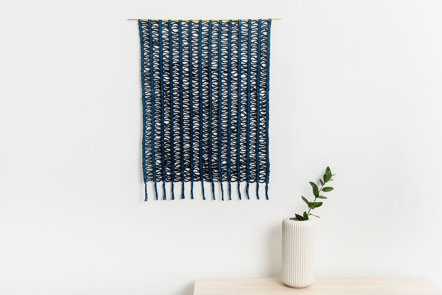 This indigo-dyed open weave wall hanging is handcrafted from a combination of mercerised cotton and bast fibre. The handwoven wall hanging is placed on a brass rod.