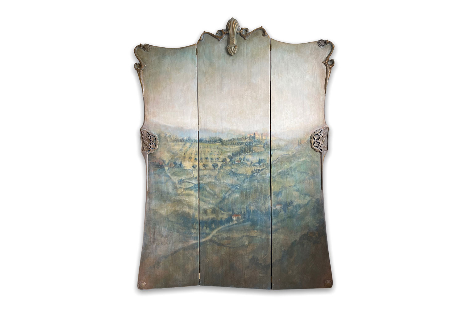 Three-leaved wooden folding screen featuring a polychrome painted scene reminiscent of a Tuscan landscape. The screen incorporates wooden carvings and reclaimed metal ornaments.