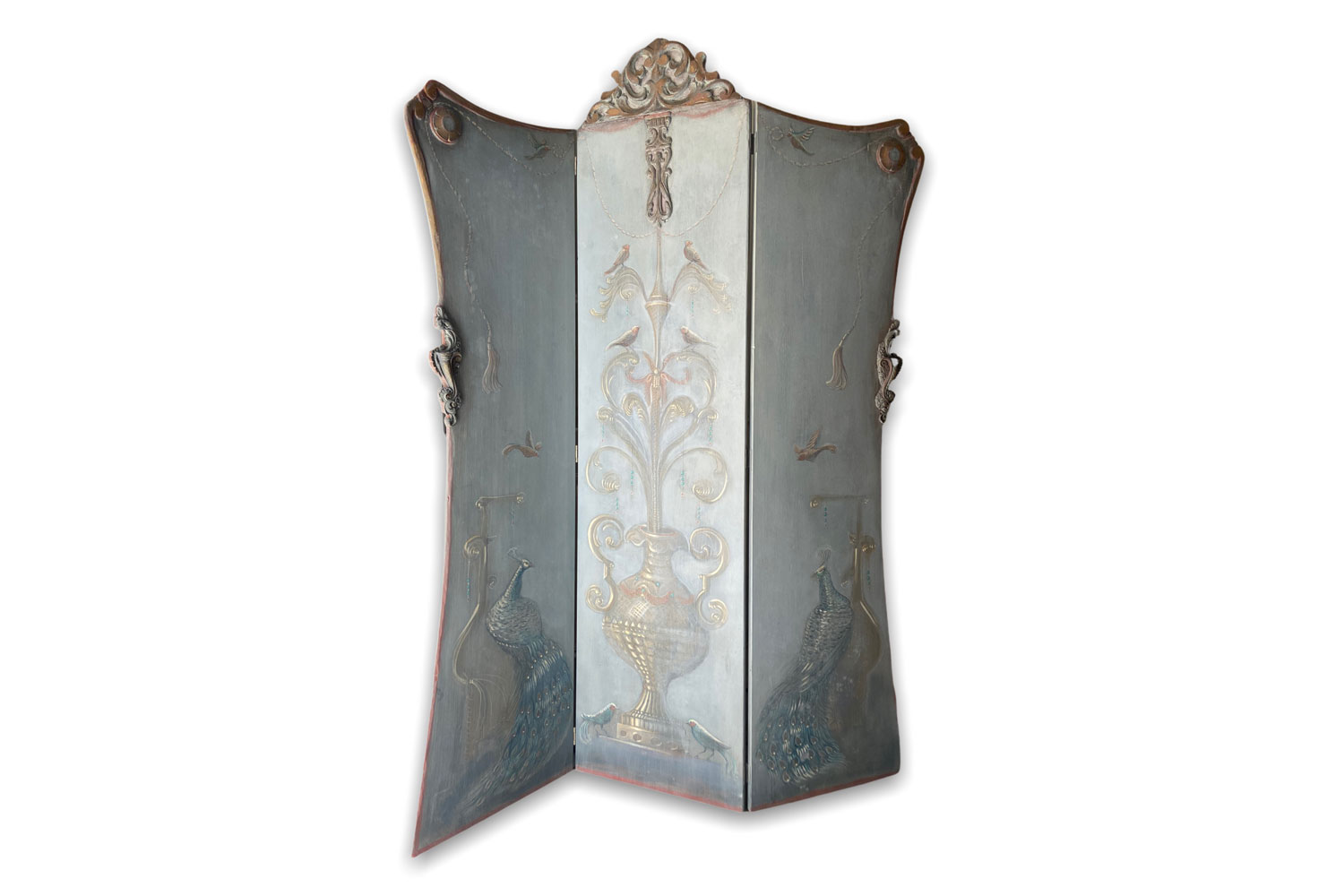 Three-leaved folding screen with wooden carvings and metal ornaments in light blue hues and reds. This screen was inspired by theatre and the backstage changing rooms.