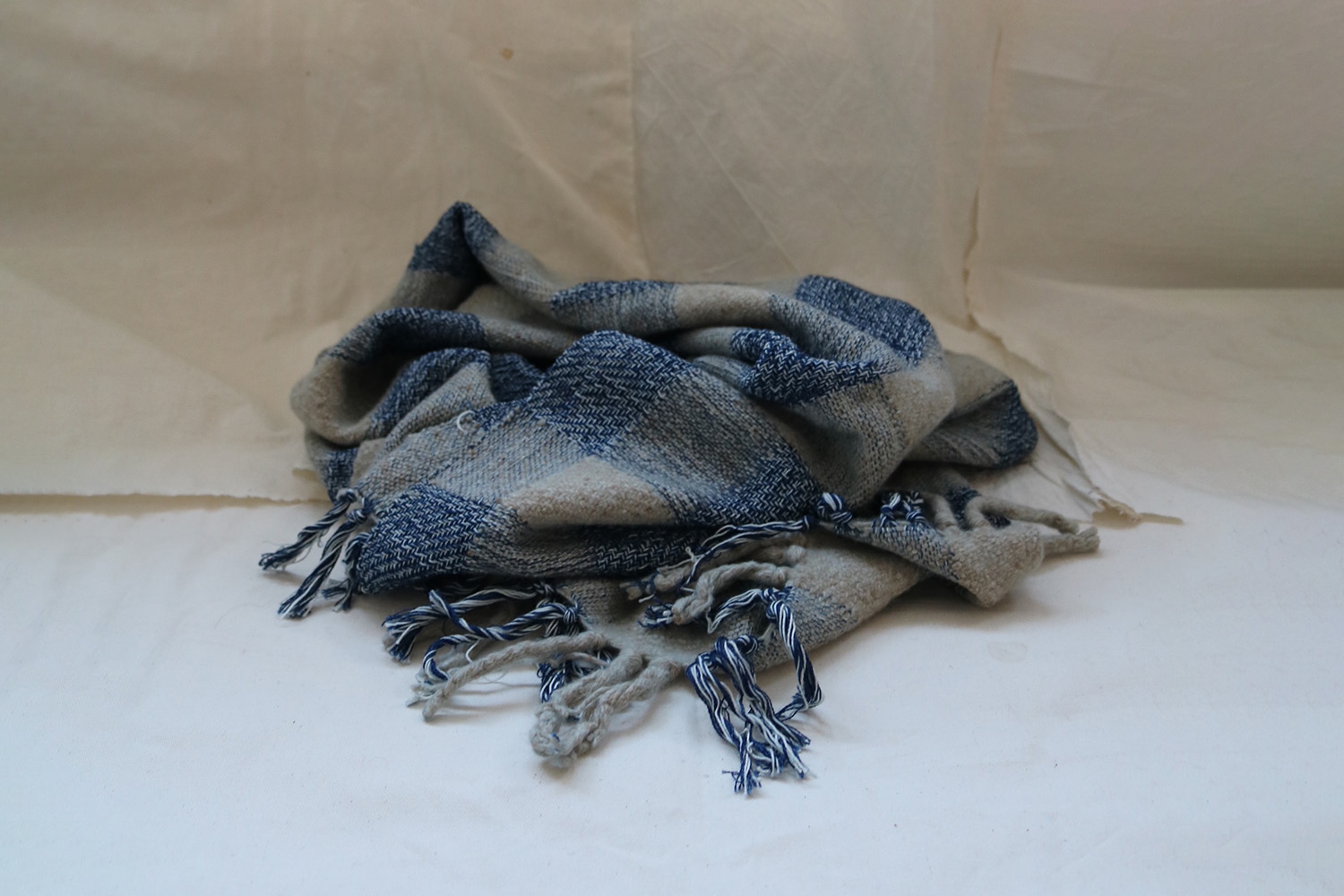 The Lisa Shawl is a hand-woven, wearable, functional and decorative blanket made from undyed British lambswool and surplus stock indigo dyed cotton on Hollie Ward's eight shaft jack loom. The yarns are woven together into a large scale chequered pattern.