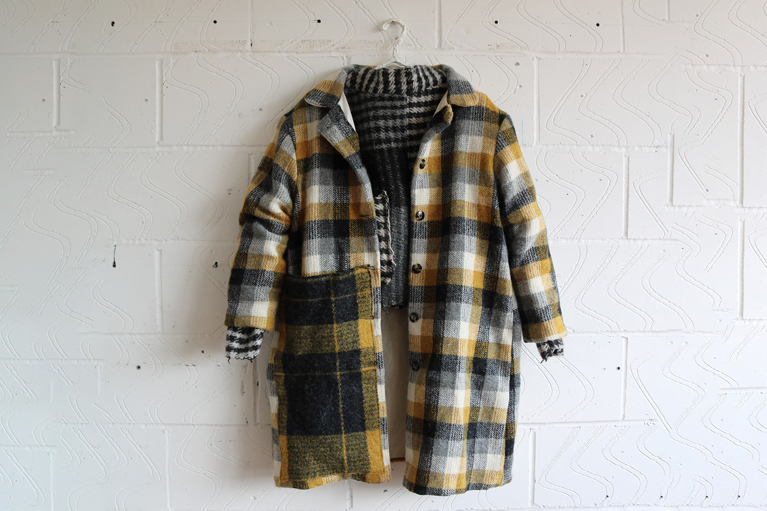 Artefact 0010 is a hand-woven, both decorative and wearable outerwear garment. To construct it Hollie Ward used her eight shaft jack loom and Shetland wool in mustard, white, grey and charcoal colours.