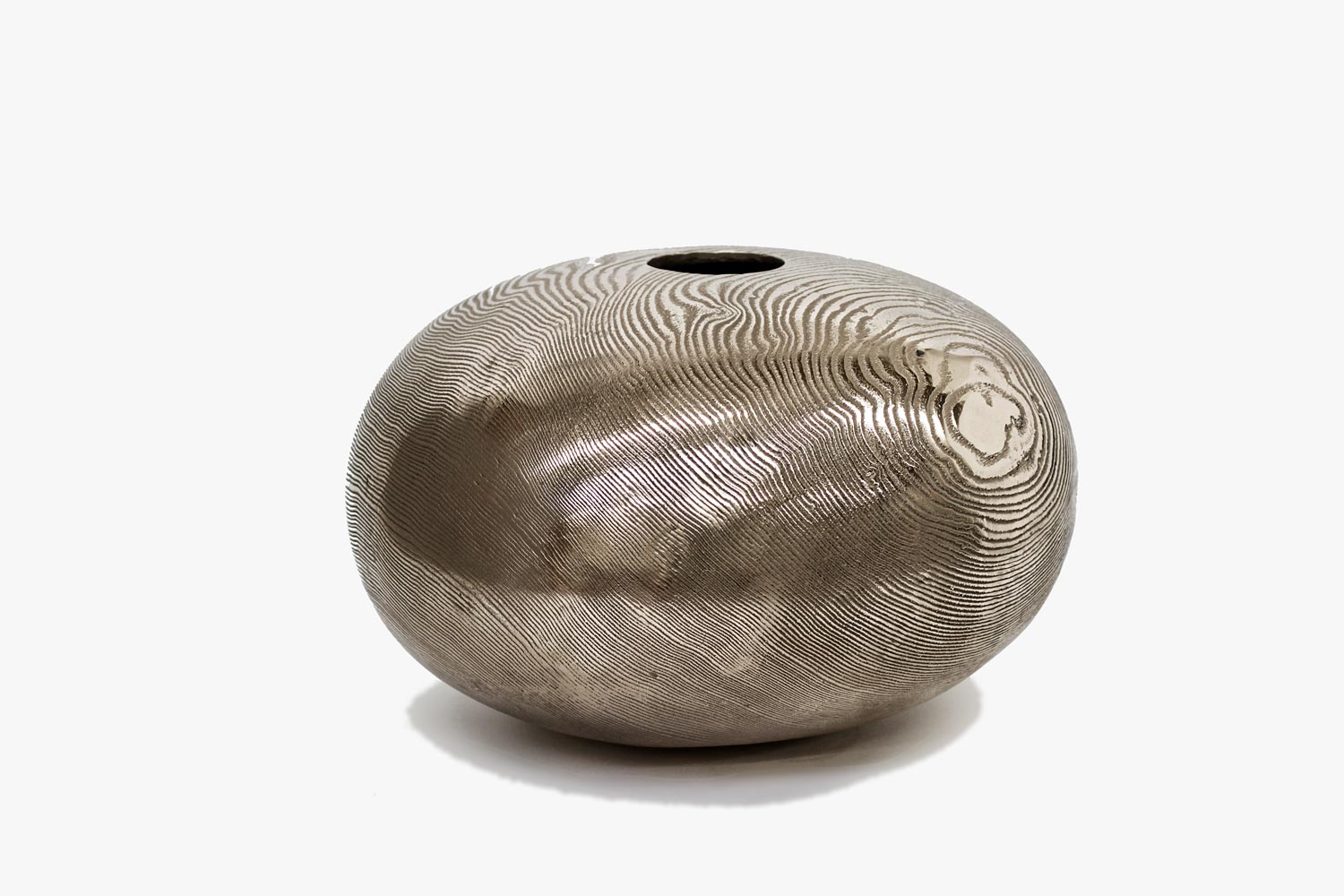 This striking vessel was made by Alexander de Vol from wood and then cast in bronze. The organic features of the wood are juxtaposed with the metal alloy and its patina.