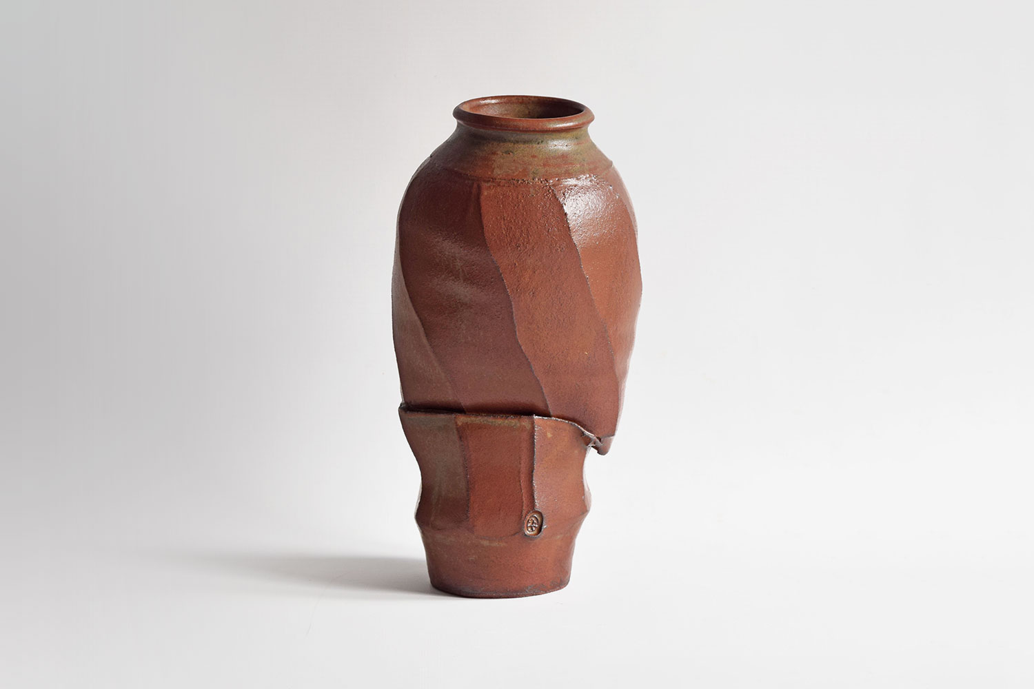Made from a Red stoneware clay, this piece has been thrown on a potter's wheel. Using the technique of faceting, the pot has been cut into an eight-sided cylinder before being shaped from the inside, causing the facets to twist. Finally, the piece has been cut horizontally and twisted to separate the pot into to distinct sections. The piece is lightly glazed in a wood ash to give the red clay body a sheen.