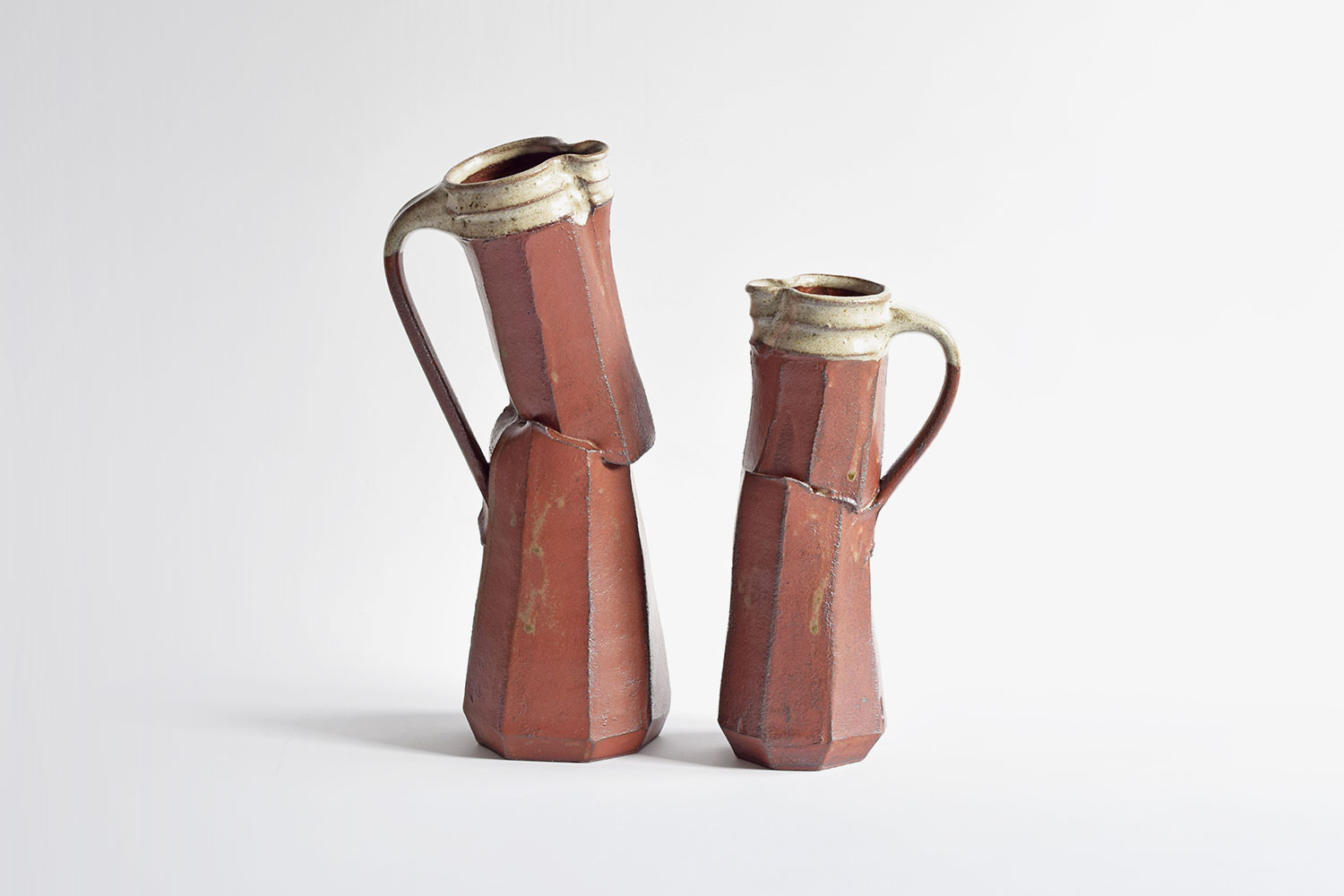 These two functional water jugs are made from red stoneware and glazed in wood ash with a white glaze detail on the rim. These pieces have been thrown and faceted before being cut and twisted in an effort to amalgamate Adam's interest in traditional studio pottery and abstract sculpture.