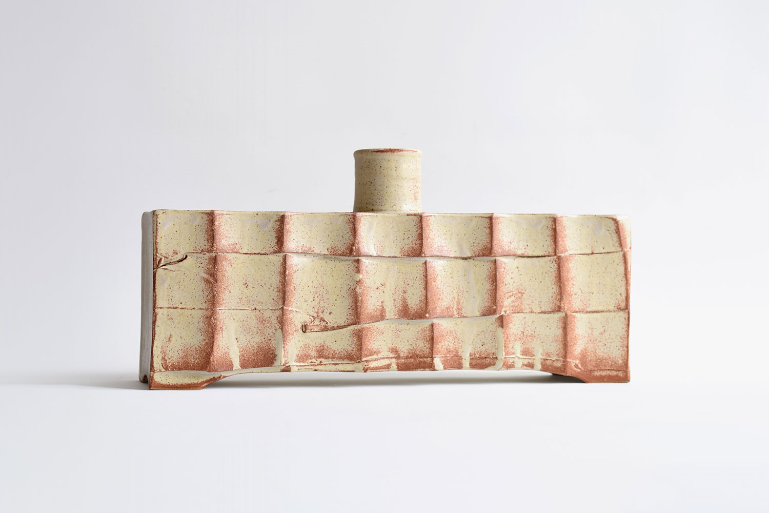 This piece is from a series of slabbed bottle forms which has taken inspiration from traditional British and Asian studio pottery forms. The faceted surface has been thrown on a potter's wheel, before being cut and manipulated to form a tactile surface. The box form is then constructed from slabs of clay, finally adding a thrown bottleneck to finish the piece. Glazed in a wood ash which breaks to orange on the details.
