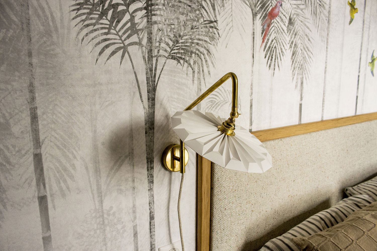 The lampshade of the Piléa wall lamp is made by folding a single piece of paper. The use of the same fold creates facets and edges that reveal themselves according to the time of day. On its brass support, as if delicately placed on its stem, the leaf-like lamp diffuses light through its veins.
