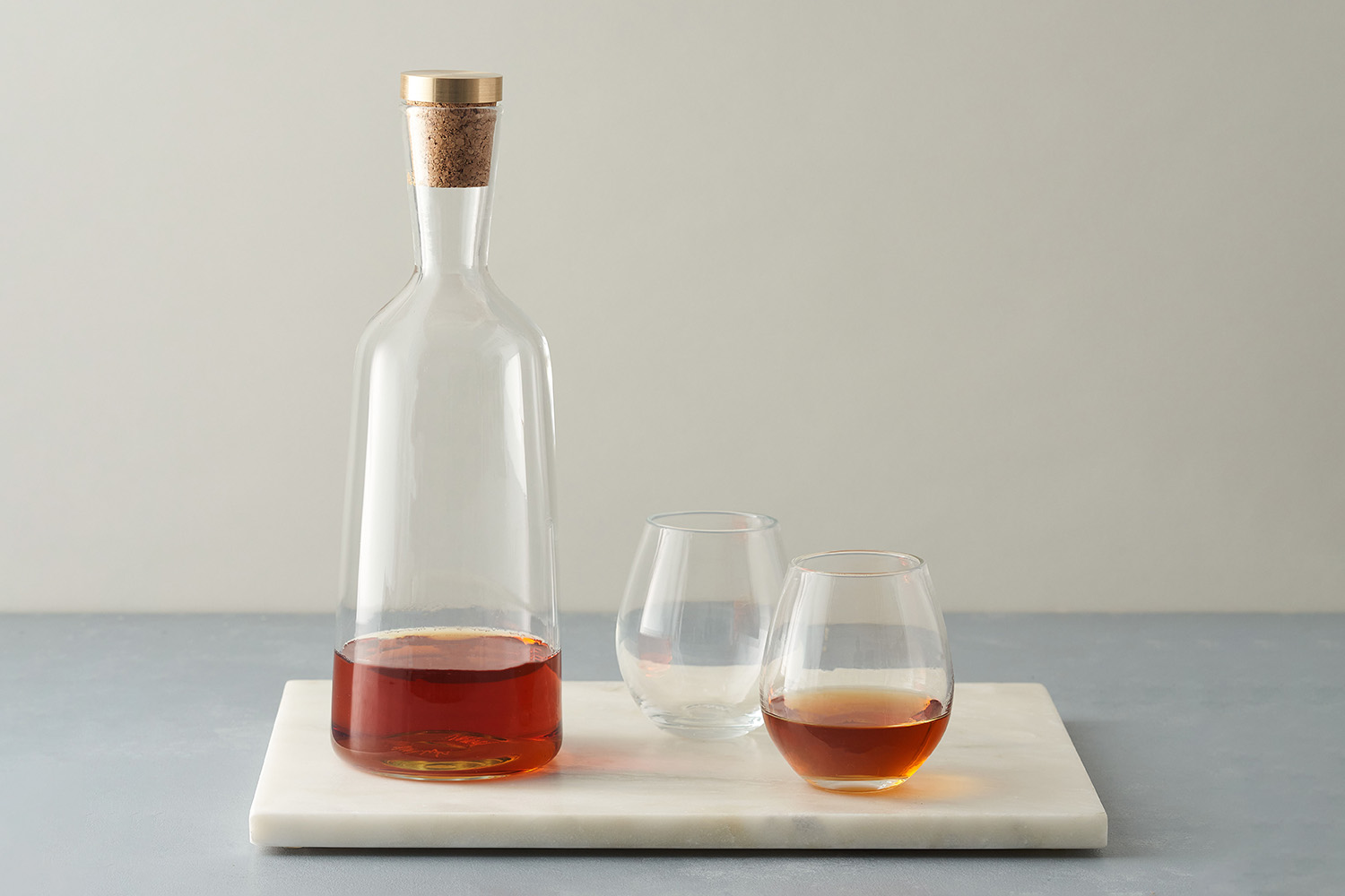 Handblown by Michael Ruh, the decanter form is unembellished and clear, with a cork and turned brass stopper that lends gravitas and ceremony to the simple form. Accompanying the decanter are two clear whiskey glasses. Gota means a drop of water in Spanish.