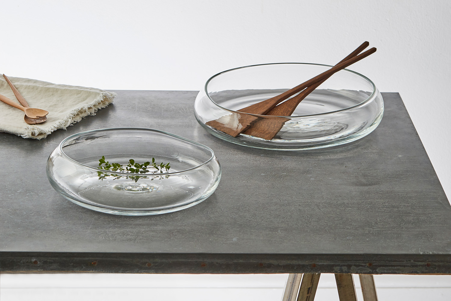 These utilitarian glass bowls are crafted from pure clear optical-quality glass with the lip folds inwards to keep the salad leaves firmly in place when serving.