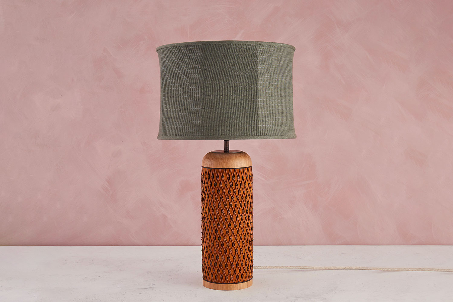 A barrel shaped table lamp, made from an oak base hand turned on a lathe. The main section of the base is hand decorated using intricate tan leather braid work in a diamond lattice pattern. The drum lampshade is made from hand dyed grey linen, featuring delicate pin pleats created using a smocking machine, and is lined with grey sand washed silk.