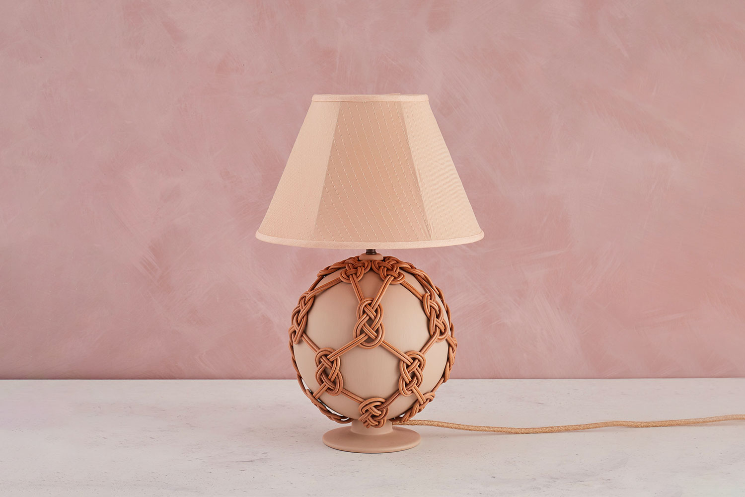 The Orb Table Lamp is comprised of a sphere base on a stand, and is made from timber hand turned on a lathe. The lamp base is hand painted in a trout colour, and then hand knotted with natural leather cord, using a sailor's knot known as a Carrick bend. The knots are linked together and ‘hold hands' around the sphere, but do not completely cover the base, allowing the painted colour to show through.