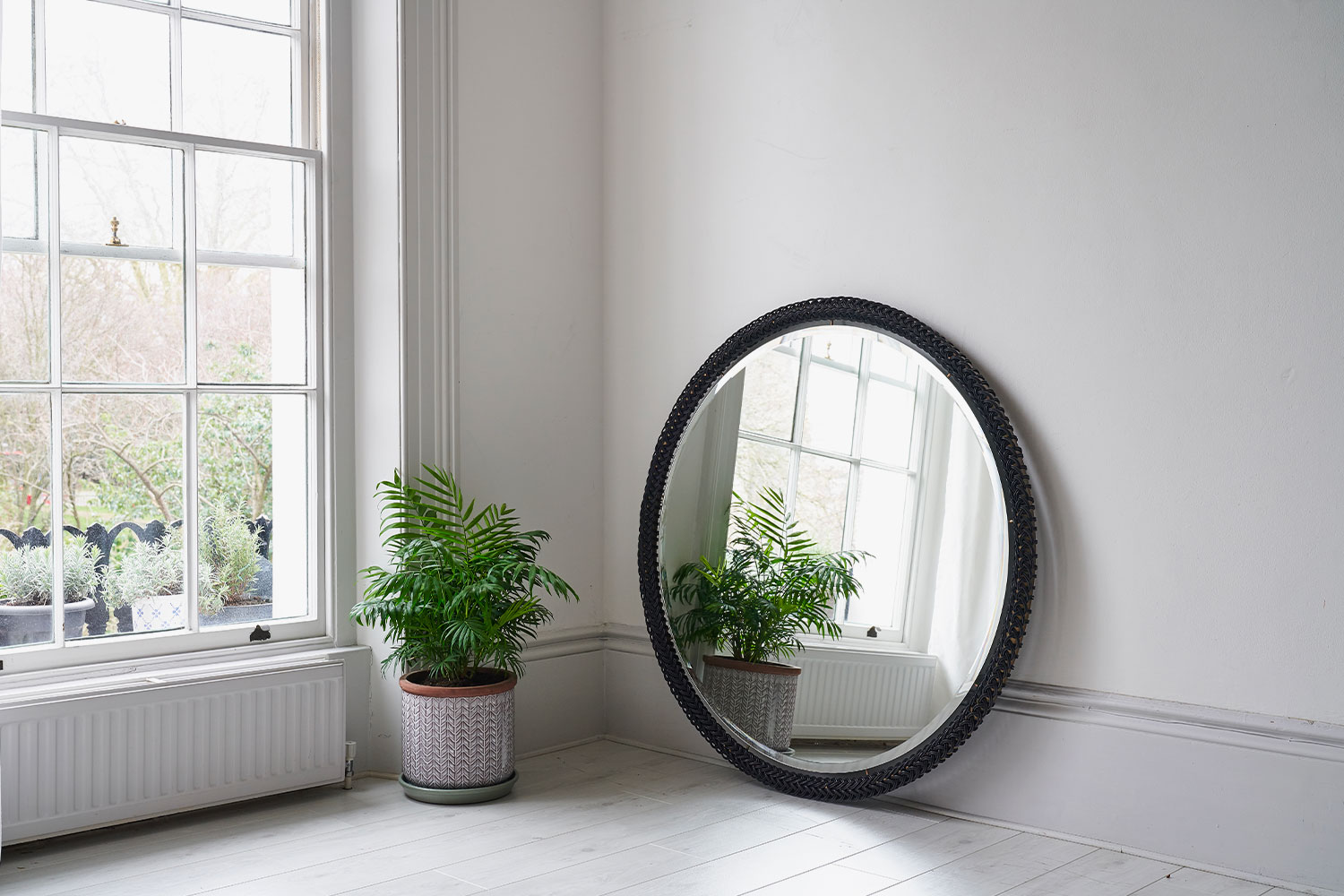 The Ricasso Loop Mirror is a circular mirror made from a two-inch rolled brass tube frame, finished with a dark bronze patina. The frame is decorated with a black veg tanned leather cord using a technique known as looping. In the centre of the frame there is a circular mirror with a bevelled edge. There is a visible gap between the frame and the mirror, as the mirror is suspended on small brackets that are connected to the frame.