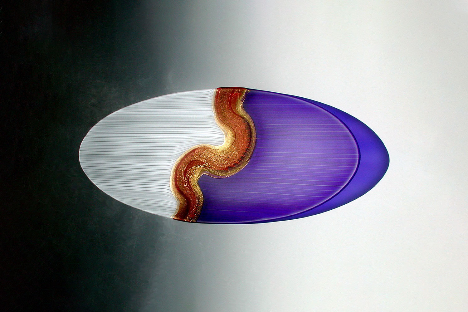 This large handcrafted oval plate was formed by fusing various pieces of coloured glass. Blue and white pulled canes are connected via a wavy, river-like band of red glass coated with gold leaf. The plate was sandblasted, avoiding the gold leaf, and then slumped. The piece was commissioned by the municipality of Ebeltoft to be presented to Queen Margrethe II of Denmark, on her official visit to the town in 2015.