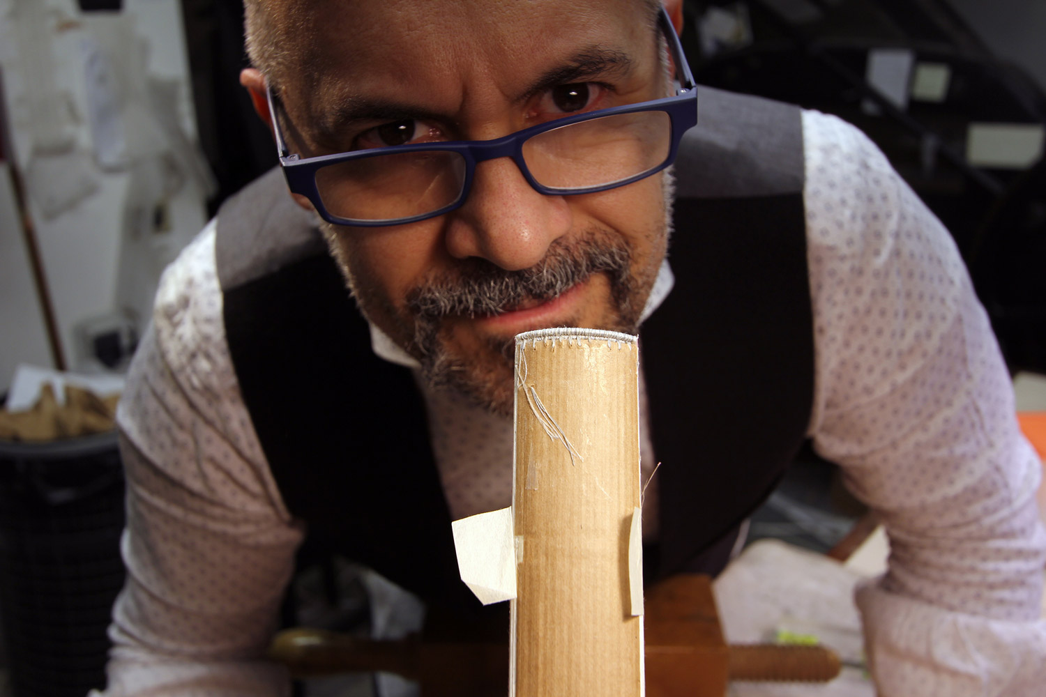 The French-style binding is in brown goat leather and covered with a complex mosaic. The upper and lower edges are in black and ochre goatskin. The cover is composed of a rectangular inlay of python skin gilded with 23 carat gold leaf, two horizontal bands of ivory and an engraved ebony plate. The title in calf leather laminated with 23 carat gold leaf is placed above a large tiger's eye. The binding is protected by a folder and a decorated case.