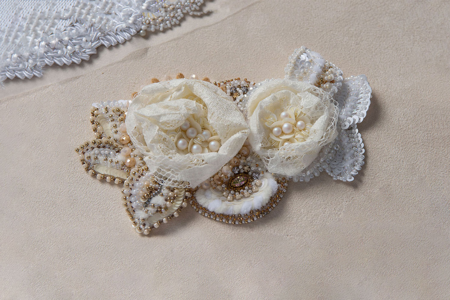 Roses was created especially for the Wedding collection. It was handcrafted using the Lunéville technique as well as Indian, 3D volume and needle embroideries. It could be used as a buttonhole, a fascinator, or to accessorise a dress.