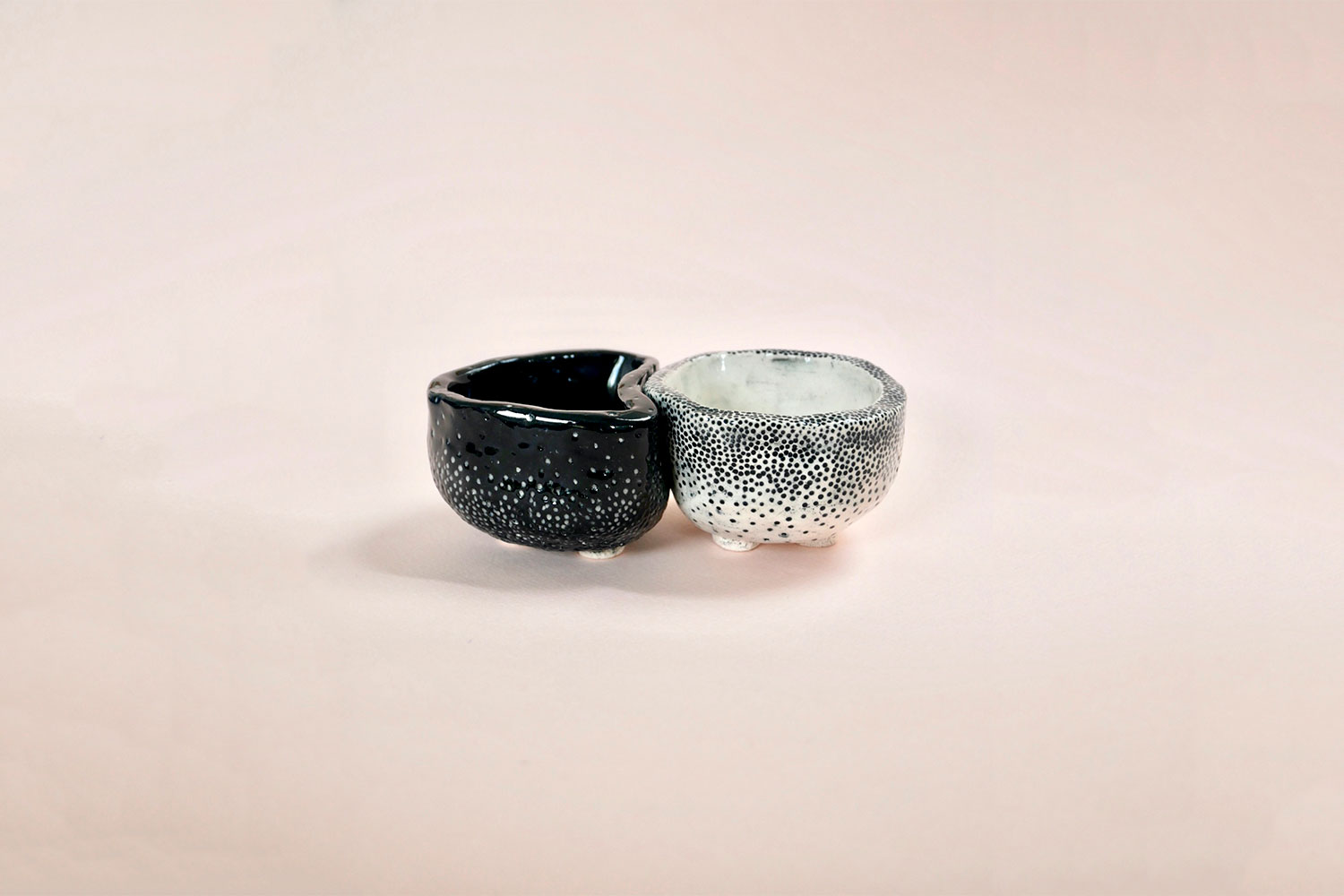 These salt and pepper pots by Yasmin Falahat slot subtly into each other due to their curvy edges. One is glazed in black, with white dots at the bottom which gradually become less dense towards the rim of the pot. The other is the inverse: white with black dots, which are dense at the top of the pot and less so at the bottom. Both have small ‘feet' on the underneath, which raises them up.