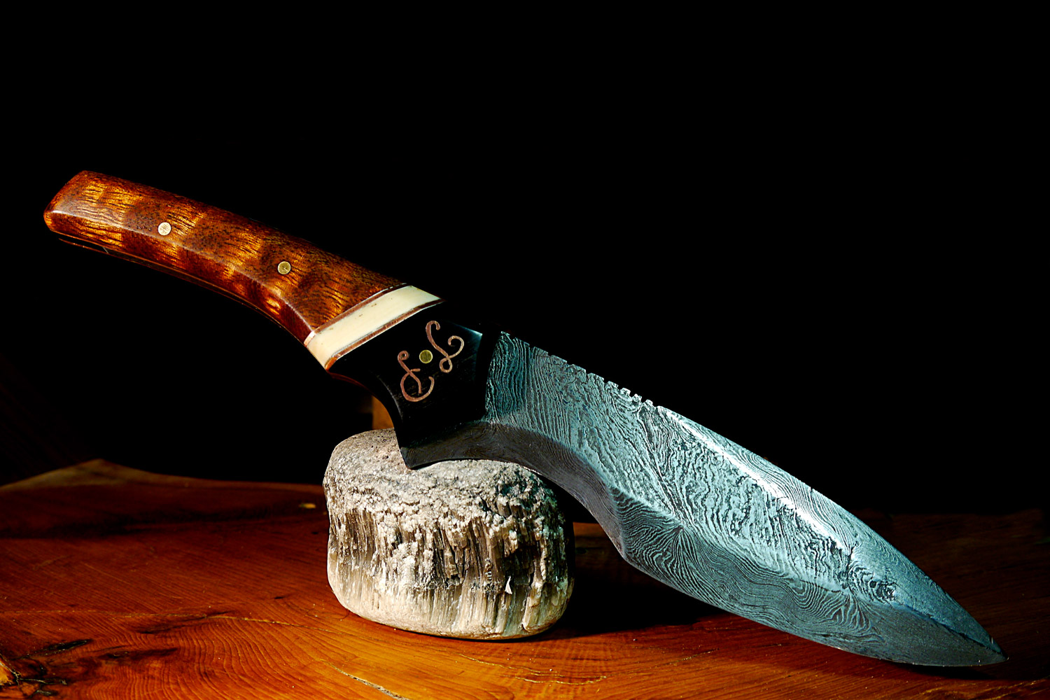 This unique tracker knife was made for a private collector with his initials inlaid with copper on the handle. The blade is made of hand forged dziwer steel, a pattern welded steel, mistakenly known as Damascus steel. The handle is made of the best quality Hawaiian curly koa, mammoth tusk and black 5000-year-old bog oak with a C14 carbon dating certificate.