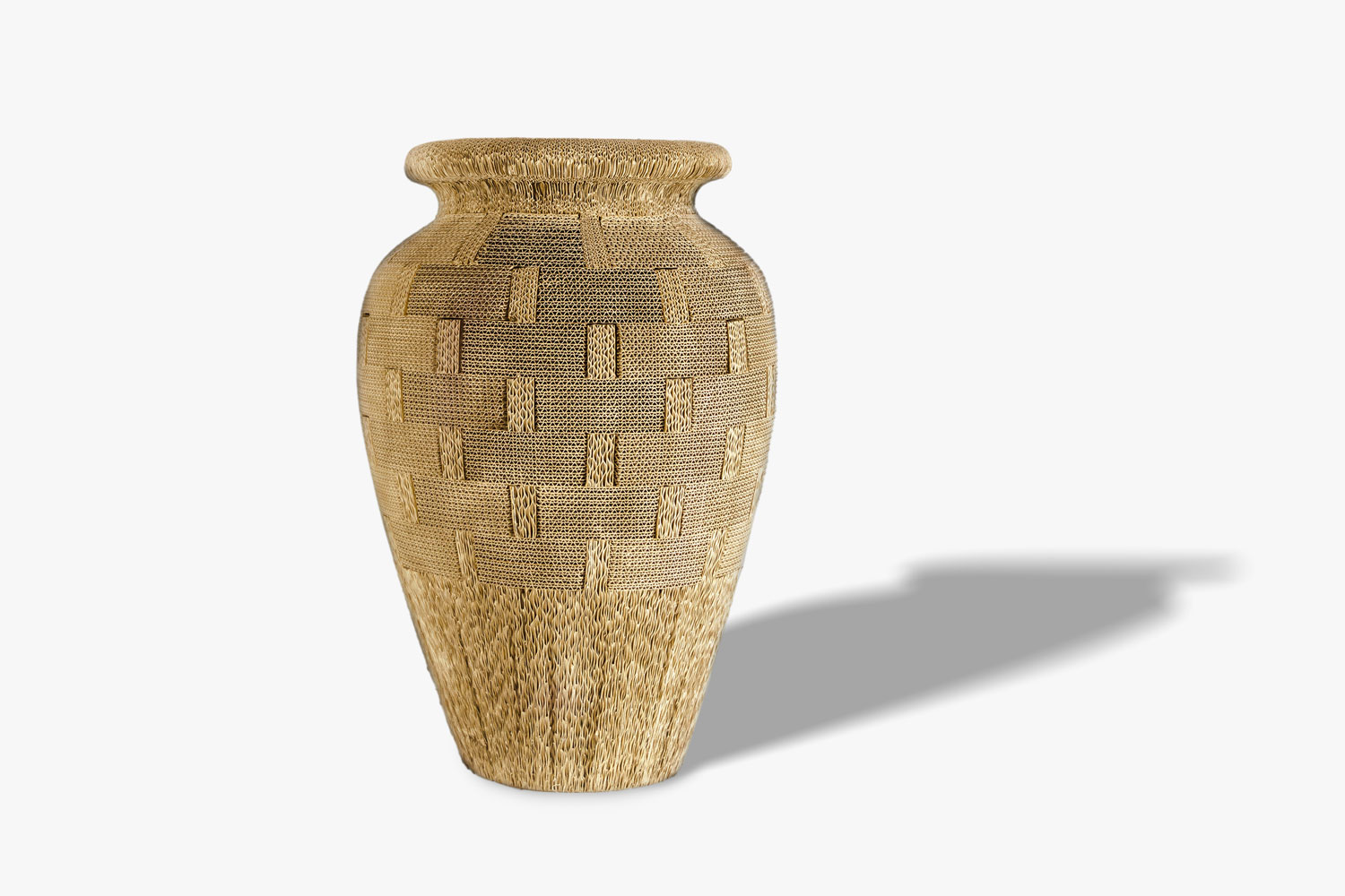This wide indoor vase can be used as furniture, for inserting plant ornaments, as a cache pot or as a base for a living room lamp. Intrecci vase is entirely made from cardboard, 80 percent of which are recycled materials. The light and dark effects of the intrecciato pattern are given by the clever arrangement of each individual piece, which exploits the different directions of their internal flutes to capture or repel light.