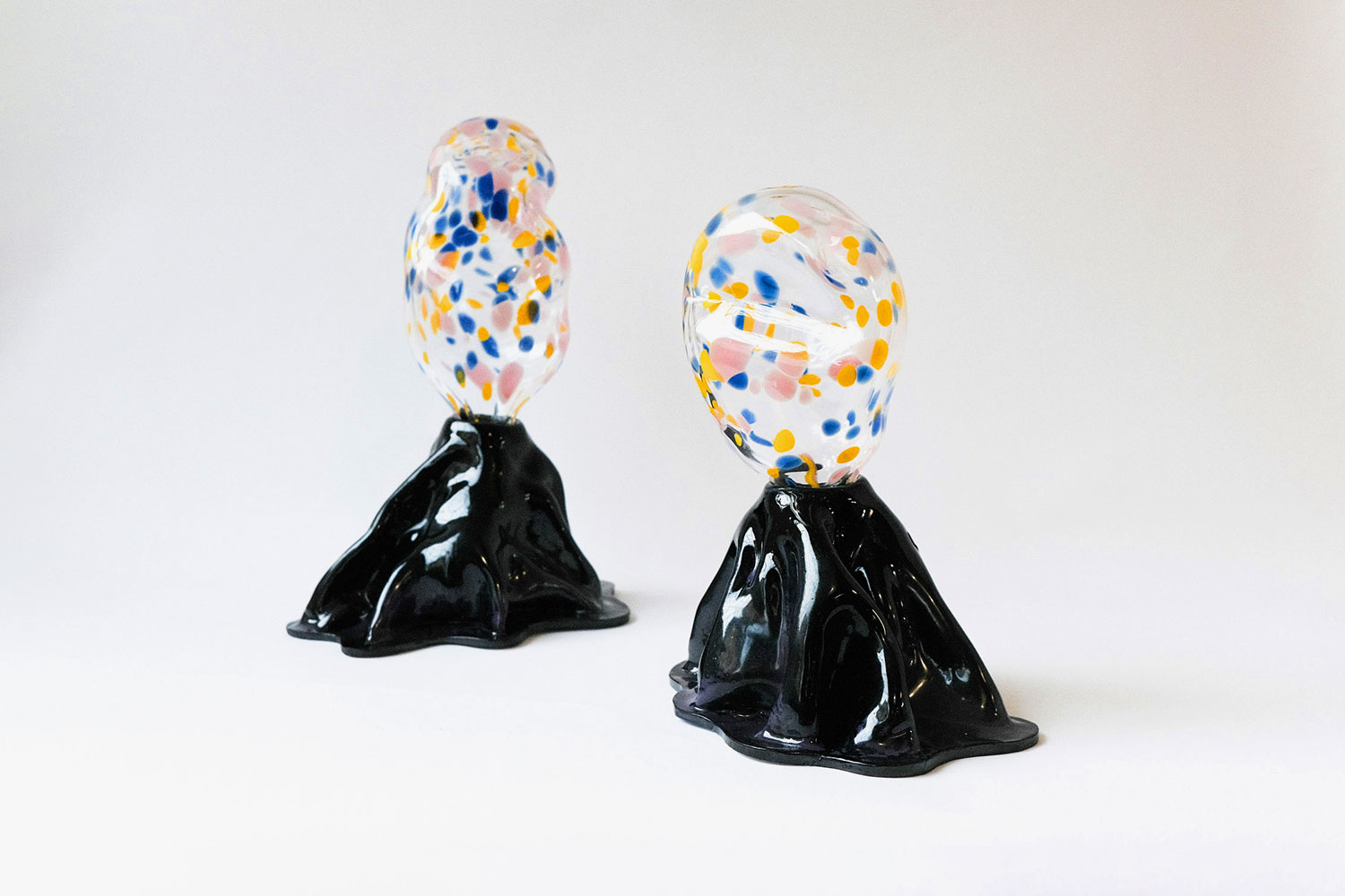 These small, black volcano vases by ceramicist Kartini Thomas spout bubbles made of spotted pink, blue and yellow blown glass. The glass bubbles are designed to both sit on top of the volcanos, and be turned on their sides and used as vases themselves.